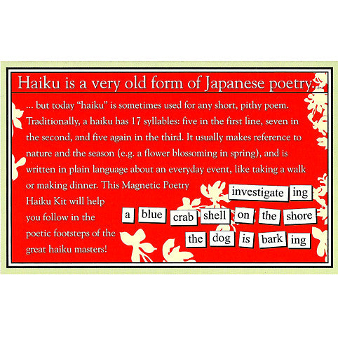 Haiku is a very old form of Japanese poetry which traditionally has 17 syllables and makes reference to nature and the seasons. This kit will help you follow in the footsteps of the great Haiku masters. Includes words such as birch, tree, thunder, rise, shell, shore and window.