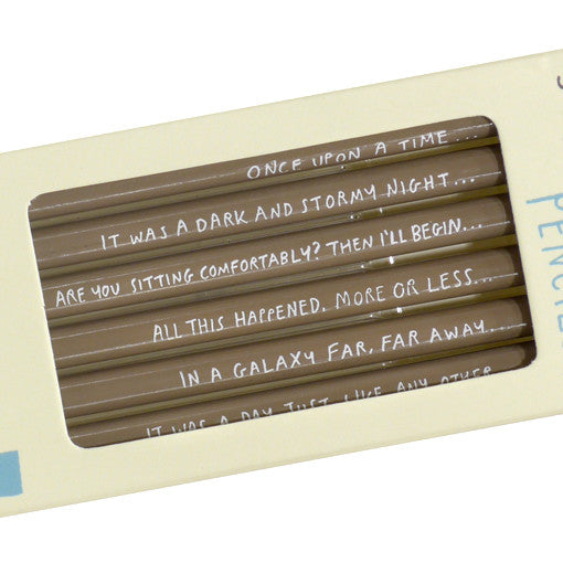 An inspirational set of pencils for storytellers. Each pencil features a classic opening line printed on the side. The text includes: 'It was a dark and stormy night...', 'Once upon a time', 'It was a day just like any other', 'All this happened. More or less.' and others.