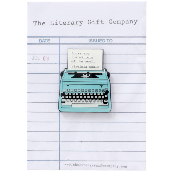 A great bibliophile quote from Virginia Woolf 'Books are the mirrors of the soul' on this blue green metal badge/brooch. Beautifully made out of enameled steel in Birmingham's Jewellery Quarter.